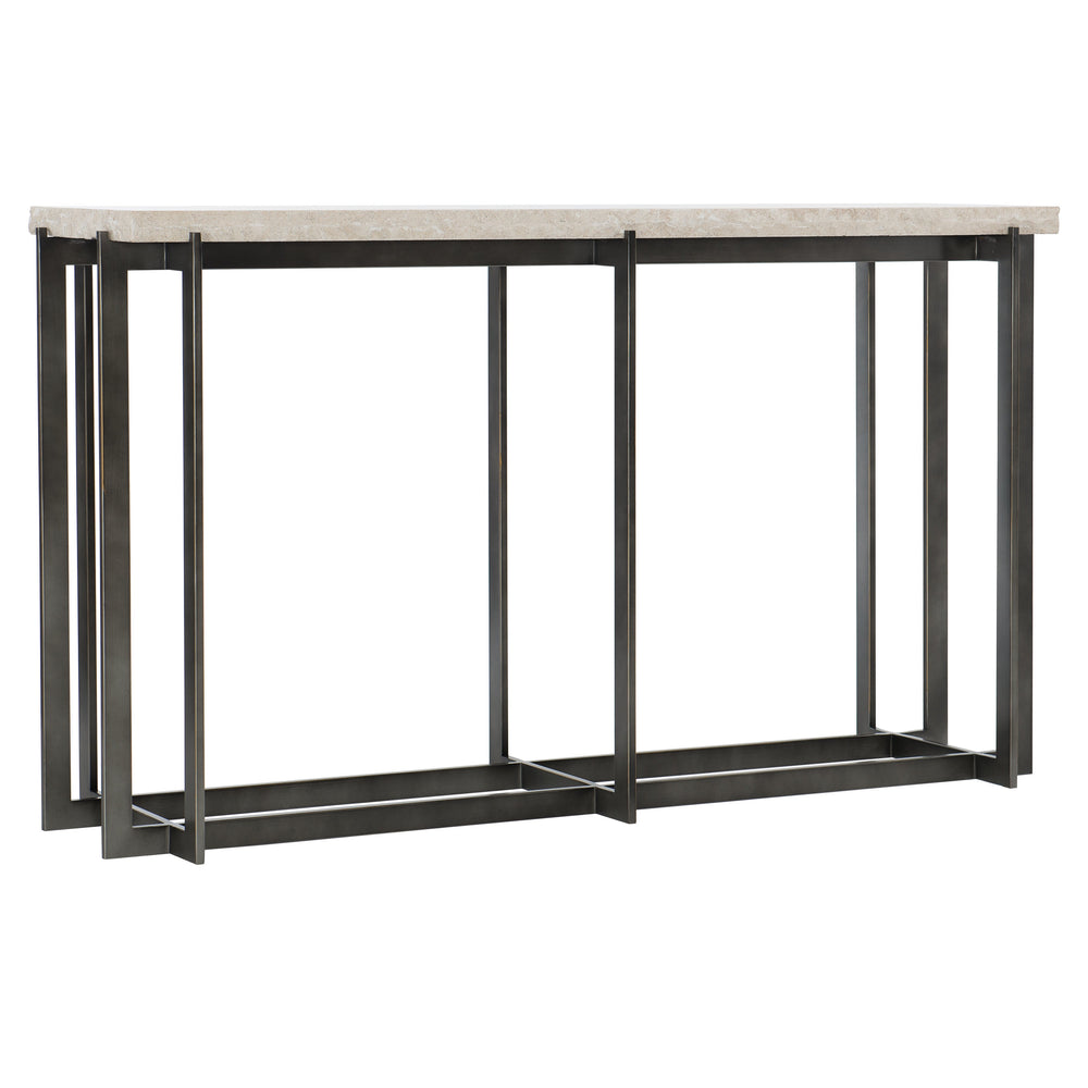 An ultra-modern take on neoclassical style, the Mariposa demilune console table features a gray-and-white stone top with a block pattern that accentuates the elegant veining in the stone. Underneath, tubular steel finished in antique pewter forms a sleek structure with needle tapered legs connected by crisscrossing stretchers. Bridging the gap between the traditional and the contemporary, this table embraces luxury while maintaining a tasteful sophistication.87.3252x38.1x147.32 HxDxW (cm)