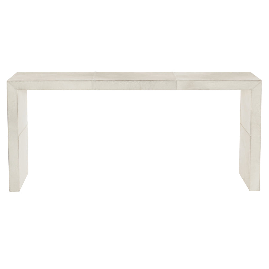 Bernhardt Interiors offers high-design furniture with an eclectic edge. Simple, sleek and stylish, the Seward console table is wrapped in white hair-on-hide for an organic, textured appeal. Saddle stitching draws attention to the masterful craftsmanship.