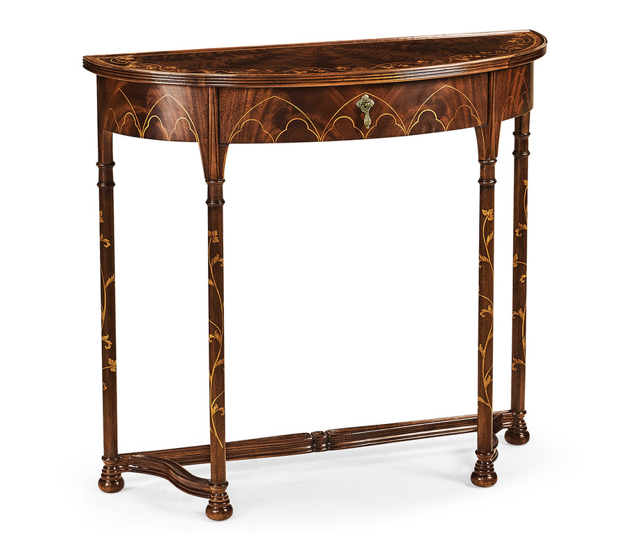 Mahogany veneered demilune console table in the "Gothic" style of the late 18th century having fine contrasting inlays to the top and frieze, and legs with painted running floral motifs and arches.