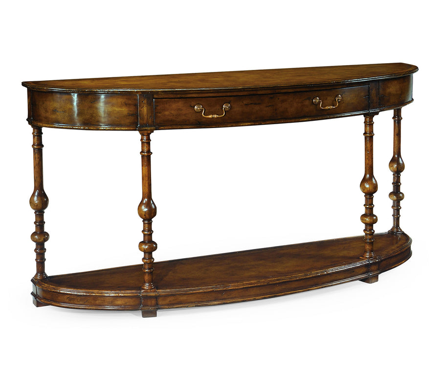 Walnut demilune console with baluster turned legs, a large single drawer and a shelf below, based on a Victorian original of c.1850. (Old salescode: 492891)