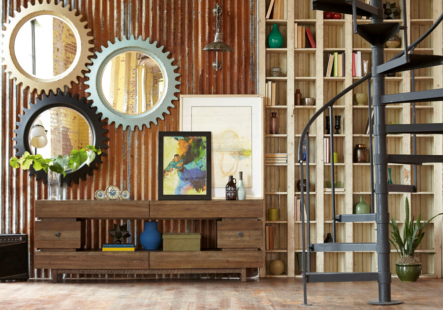At 80 inches long and a sleek 16 inches wide, the Epicenters Williamsburg Entertainment Console brings a lot of function into almost any space. The unique stacked design holds six drawers and provides open shelf display and storage on the top and in the center. The console is constructed of radiata pine and is finished in clear Reclaimed Pallet.
