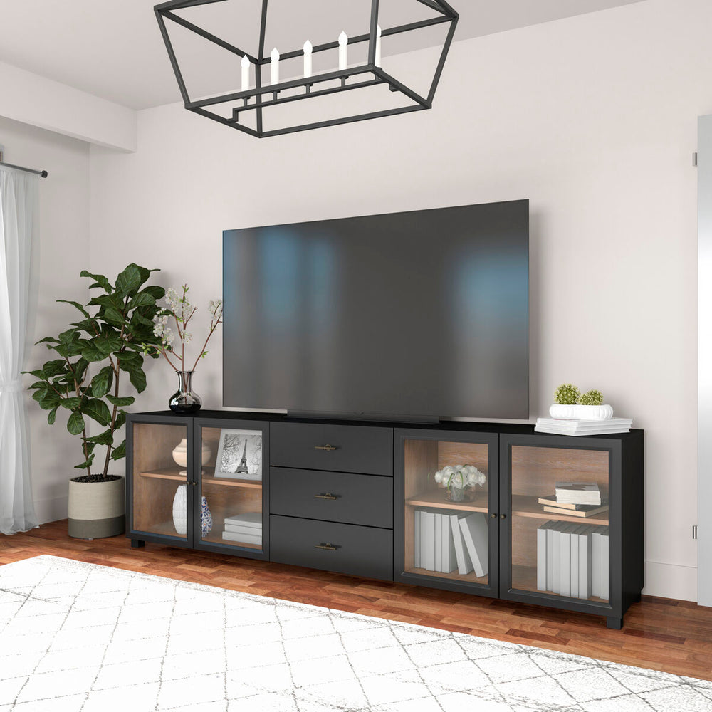 Modern technology meets farmhouse chic in this attractive two-tone entertainment console, stylishly wrapped in black with an interior chestnut finish. Two pairs of framed glass doors reveal adjustable shelving with convenient wire management for electronic devices, while three central drawers provide plenty of storage for all your living room entertainment essentials.