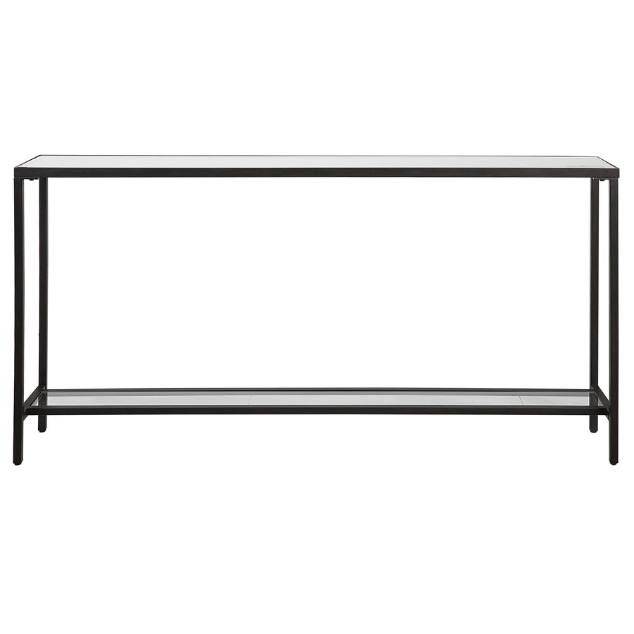 Classic And Minimalistic, This Narrow Console Table In Steel Is Finished With A Streamlined Rustic Black, Inset With A Beveled Mirrored Top, And Gallery Shelf In Clear Glass.