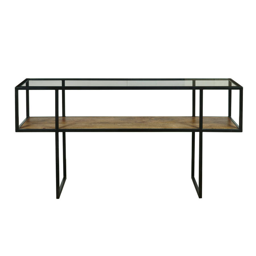 Contemporary, rustic style that's sure to tie any trendy room's presentation together,Glass top surface ideal for displaying or holding belongings,Wooden shelf provides extra space for your living room items,Wrapping metal frame,Constructed of durable wood with metal frame and a glass top for display,Assembly required