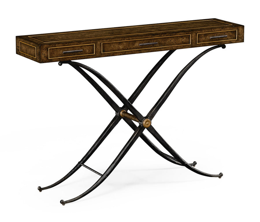 Burl oak veneered rectangular console table with inset brass beading and three drawers, the X-frame support of hammered wrought iron and the stretcher with further veneer. (Old salescode: 494488)