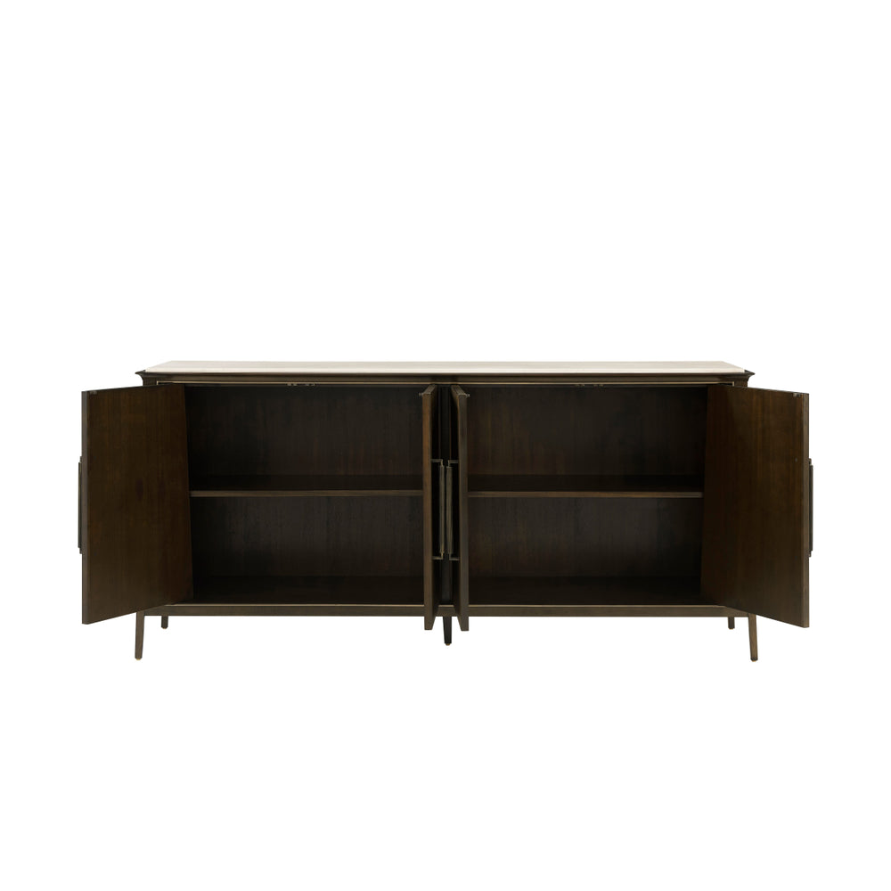 The Lido Buffet features a ophisticated tapering silhouette and reeded angular doors, crafted from Prima Vera in our Bistre finish and complimented by a beautifully honed inset Crema Marfil marble stone top. The custom forged hardware, finished in a dark rubbed bronze, echoes the reeded details throughout.