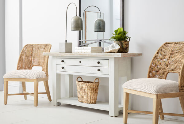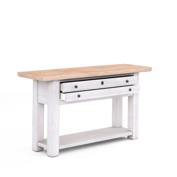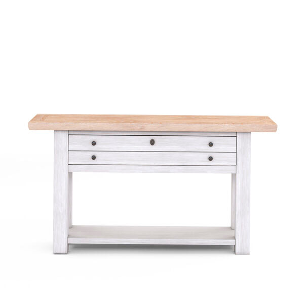 Classic vintage-inspired style meets practical storage in this multi-functional sofa table. Beautifully versatile enough for the living room, foyer or hallway, it features two generously proportioned drawers and a lower shelf that provide plenty of space for additional decor items and other essentials. Round metallic drawer pulls and an antique-style keyhole detail complement the light and airy two-tone finishes of this table.