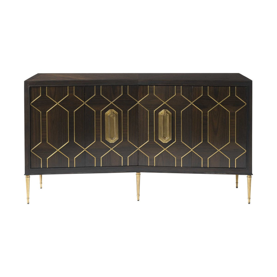 Doors of Italian smoke eucalyptus and polished brass insets in variations of hexagonal patterns set in a cabinet with a unique butterfly shape. Featuring tapered brass finished legs and dramatic overscale pulls, this cabinet will be the focal point of any room. Behind each of the two bi-fold doors there is one adjustable shelf with access for electrical wiring.