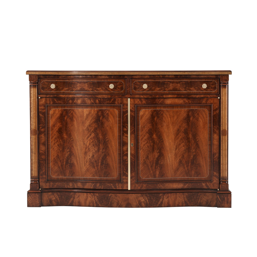 A fine flame mahogany and Morado banded side cabinet with fine double stringing throughout, the serpentine top with a parquetry edge above two panel inlaid drawers with floral brass handles, above two paneled doors enclosing an adjustable shelf, flanked by satinwood faux fluted inlaid columns, on a serpentine plinth base.