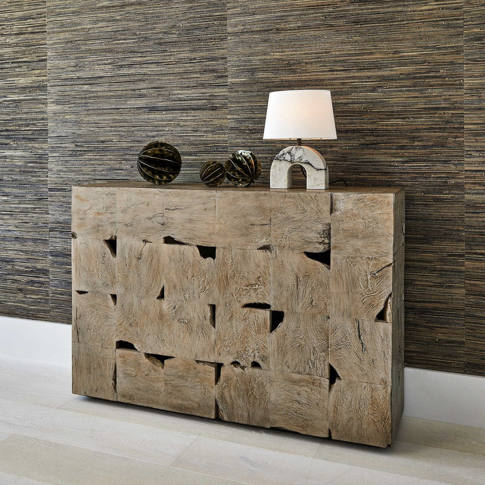 Squares of natural wire brushed teak are beautifully combined to create the Teak Tac Toe Console Table. Finished with multistep drift wood and white ceruse featuring a recessed black wood base giving the table a floating appearance. Each piece will vary.