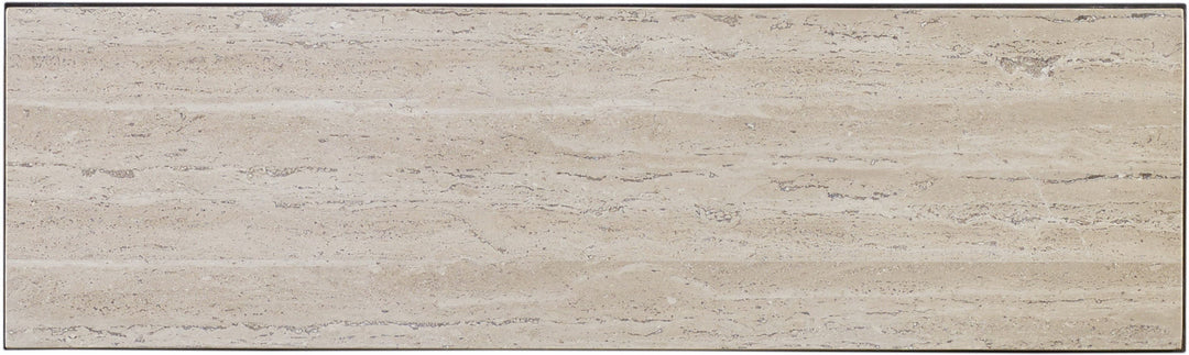 Organic and modern, this striking thin metal console in a neutral color palette has a curvy steel base and natural stone top of Travertine Marble to create an inviting focal point with a compact 40W x 12D footprint.
