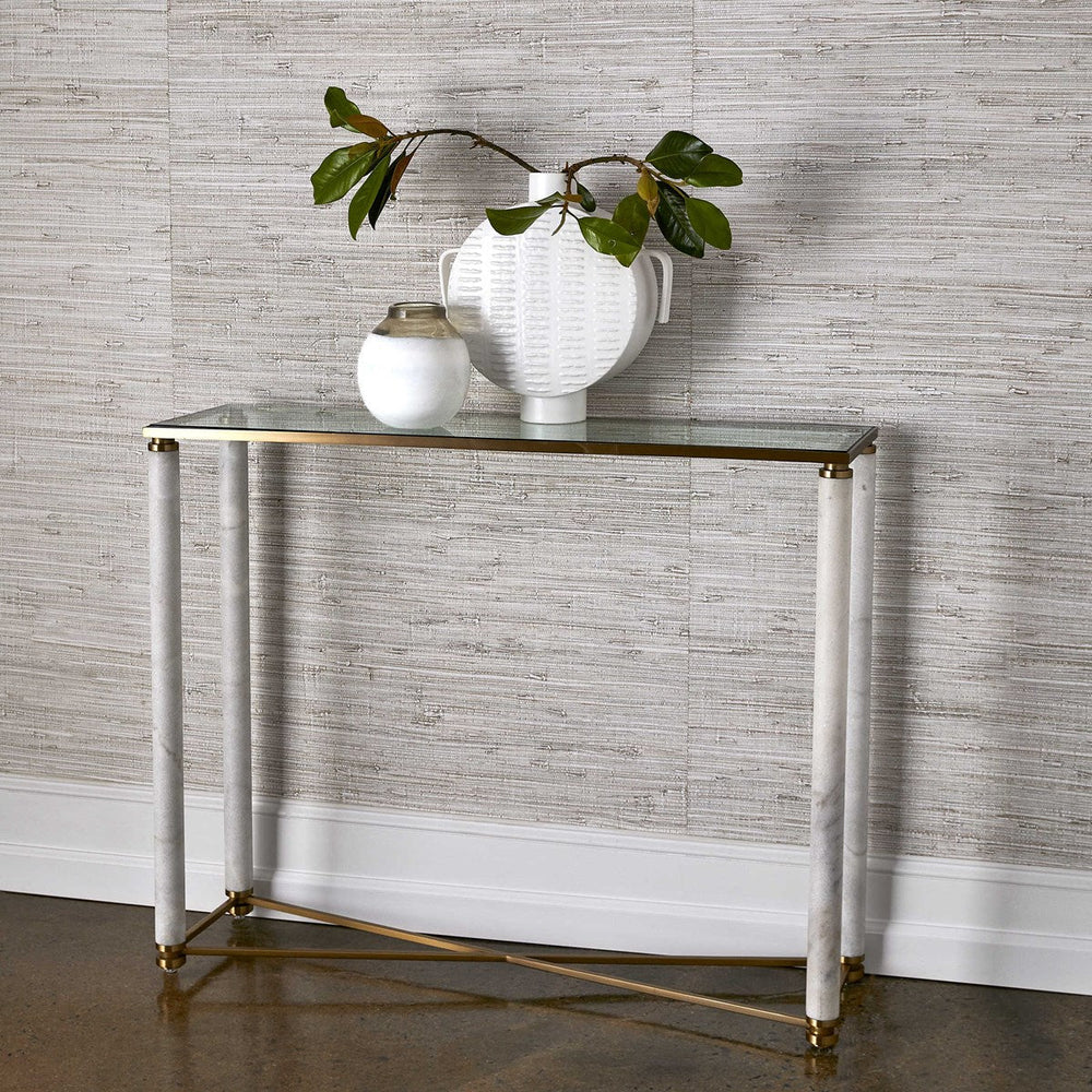 Sure to become a modern classic, this unique console table features white honed marble legs with interesting detailed feet and caps. Made of steel with a rich brass finish, it is completed with a 3/8'' thick clear, tempered glass top.