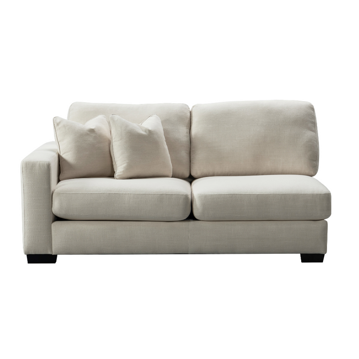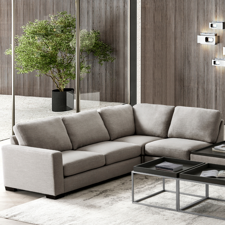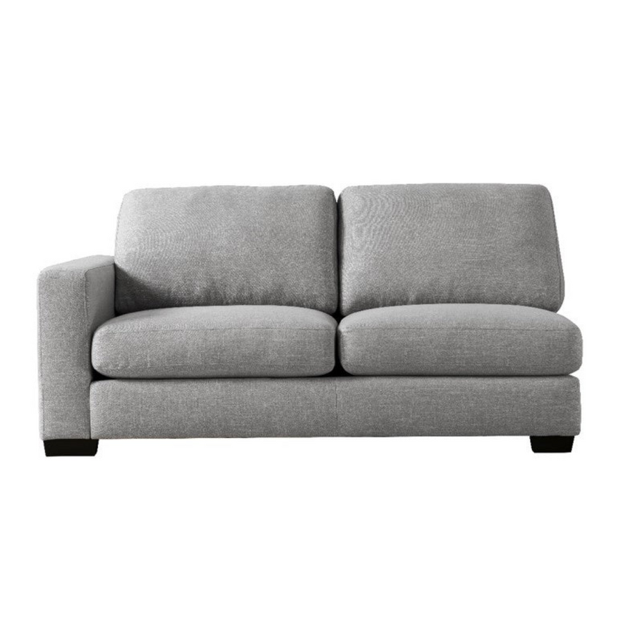 Get comfort in our trendy and spacious sectional, with its clean lines, sleek material and modern style. With plush grey fabric and charming cushions, this cozy and grand Sectional by Roots Furniture is definitely what you need in your home.