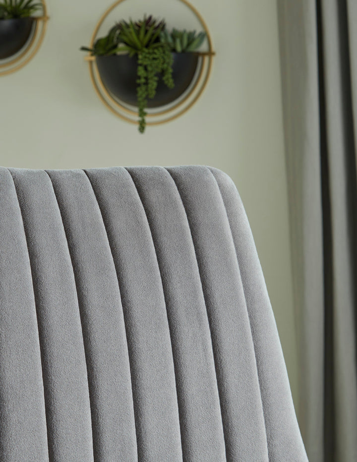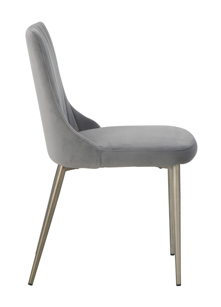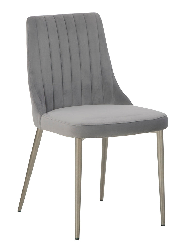 The Barchoni dining chair draws from classic design motifs to craft a fresh, contemporary look. Soft gray velvet upholstery is accented by channel stitching on the back, while warm goldtone legs add a luxe touch. Contoured for your comfort, this chair is a tasteful take on modern opulence.