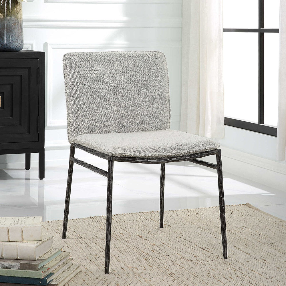 Inspired by contemporary designs, the Jacobsen Dining Chair showcases curved lines with a chiseled iron frame in a natural aged black iron finish. A casual ivory and warm gray boucle fabric accents this modern look. Seat height is 19".