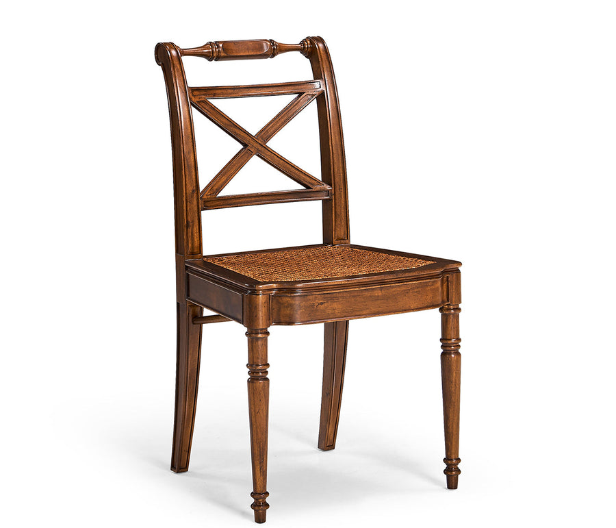 Late Regency period style walnut side chair, the shaped bar top rail above an x-frame back, caned seat and panelled breakfronted rail and turned straight legs. A classic design of the early 19th century. (Old salescode: 492147)