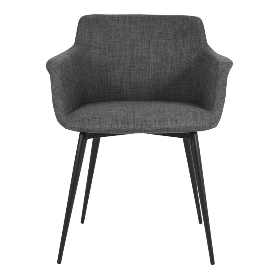 Classic mid-century design, with a modern twist. The Ronda armchair features a uniquely sculpted seat, a comfortable place to dine with foam padding and soft, easy-to-clean polyester upholstery. With its distinct silhouette including steel hairpin legs, this is a distinguished chair for the dining area.