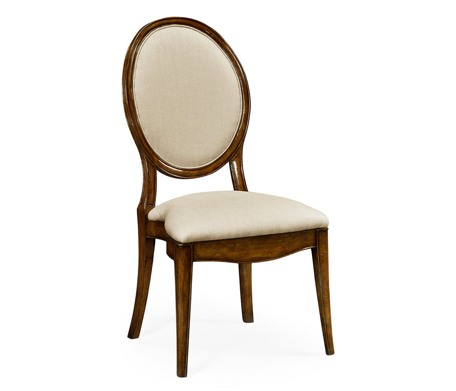 Classic, spoon backed, stacking dining side chair in walnut distressed finish, with simple moulding to the frame, a neutrally upholstered seat and curved back panel, and serpentine front rail. Tapered and curved legs to the front, raked legs to the rear. Inspired by an original design circa 1790. (Old salescode: 495380-WAL-F001)
