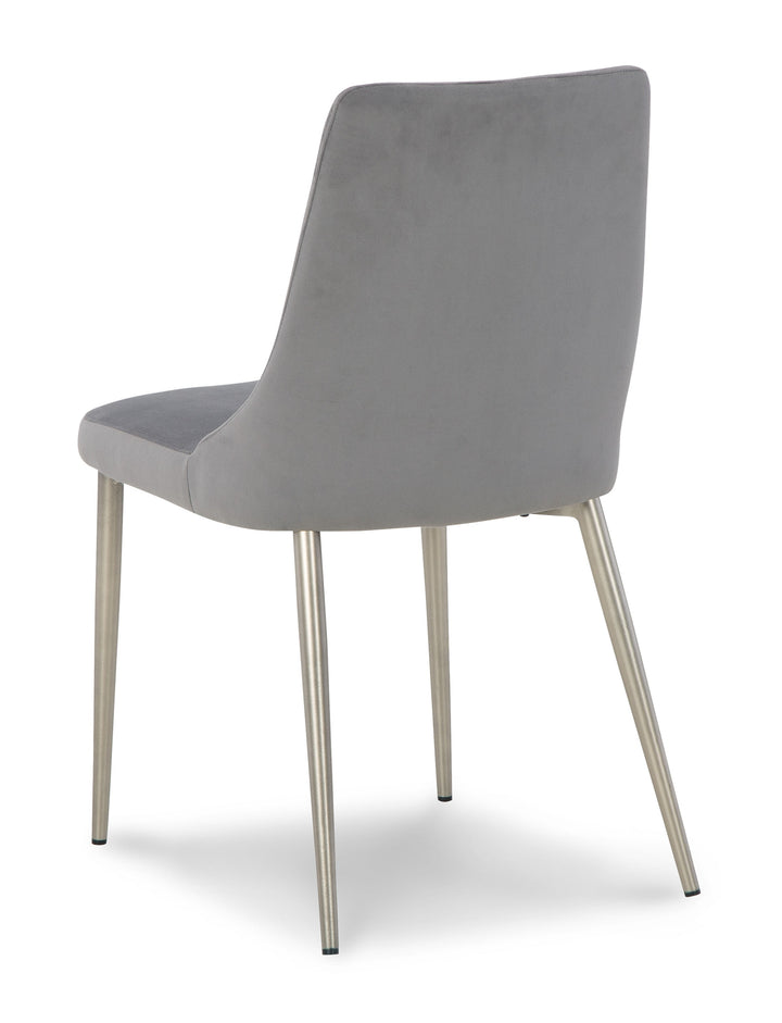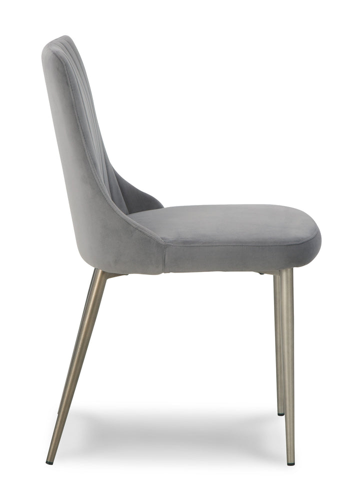 The Barchoni dining chair draws from classic design motifs to craft a fresh, contemporary look. Soft gray velvet upholstery is accented by channel stitching on the back, while warm goldtone legs add a luxe touch. Contoured for your comfort, this chair is a tasteful take on modern opulence.