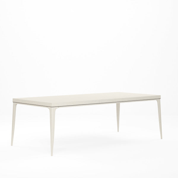Effortless elegance meets modern design in this delicate dining table, featuring clean lines, slim, tapered legs, and a stylish beaded accent in burnished bronze. Solid wood construction is beautifully accentuated by a warm alabaster finish with a plaster smooth feel that invites guests to linger at the table. This 73? table comfortably seats 10, extending to 101? with two removable 14? leaves.