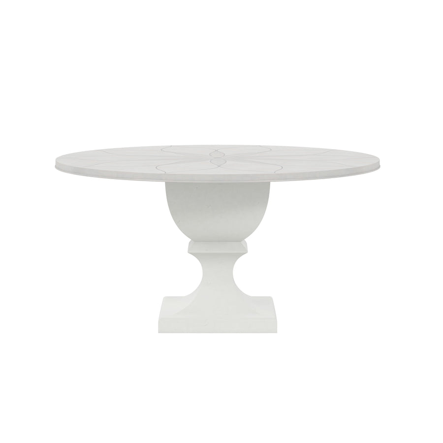 Timeless beauty meets modern design in this stunning dining table, destined to become an heirloom. The gracefully curved cast resin base resembles stone, rising to support a 60? wood top that comfortably seats six. A combination of quarter split and cathedral maple veneer combines with a contrasting veneer inlay to create an intricate floral design that will fascinate guests.