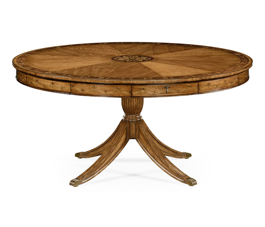 62" Satinwood round dining table with fine classical marquetry inlay to the top and sides and cast brass handles to match the marquetry detailing. Six drawers each with a marquetry placemat. Seats: 8. (Old salescode: 492515-62D)