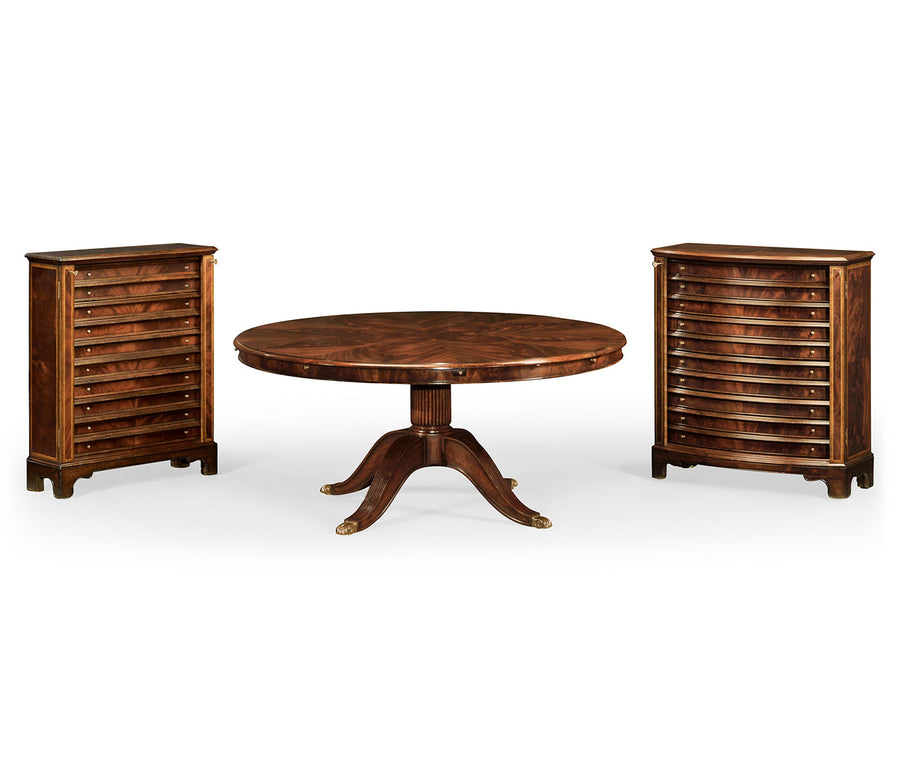 66" Late Regency style extending mahogany circle-to-circle dining table with eight cross banded interlocking leaves and a Wellington cabinet for storage of the leaves with false drawer. It can also turn into a games table and comes with two storage cabine