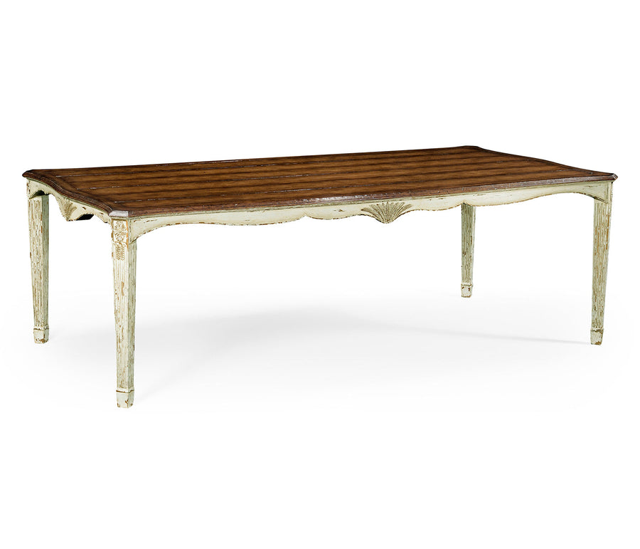French provincial style antiqued white painted dining table with distressed planked walnut top hand carved legs and aprons with fern detailing set on fluted tapering legs with spade feet. Seats: 8. (Old salescode: 493880)