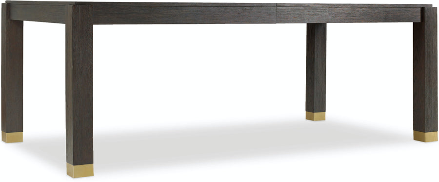 Sleek shapes and clean lines combine with a rustic deep brown Midnight finish on White Oak Veneers for a curated chic modern look in the Curata rectangle dining table. With both 20-inch leaves included, the table extends to 122 inches long and will seat 10 guests. The brushed brass feet are the finishing designer touch.