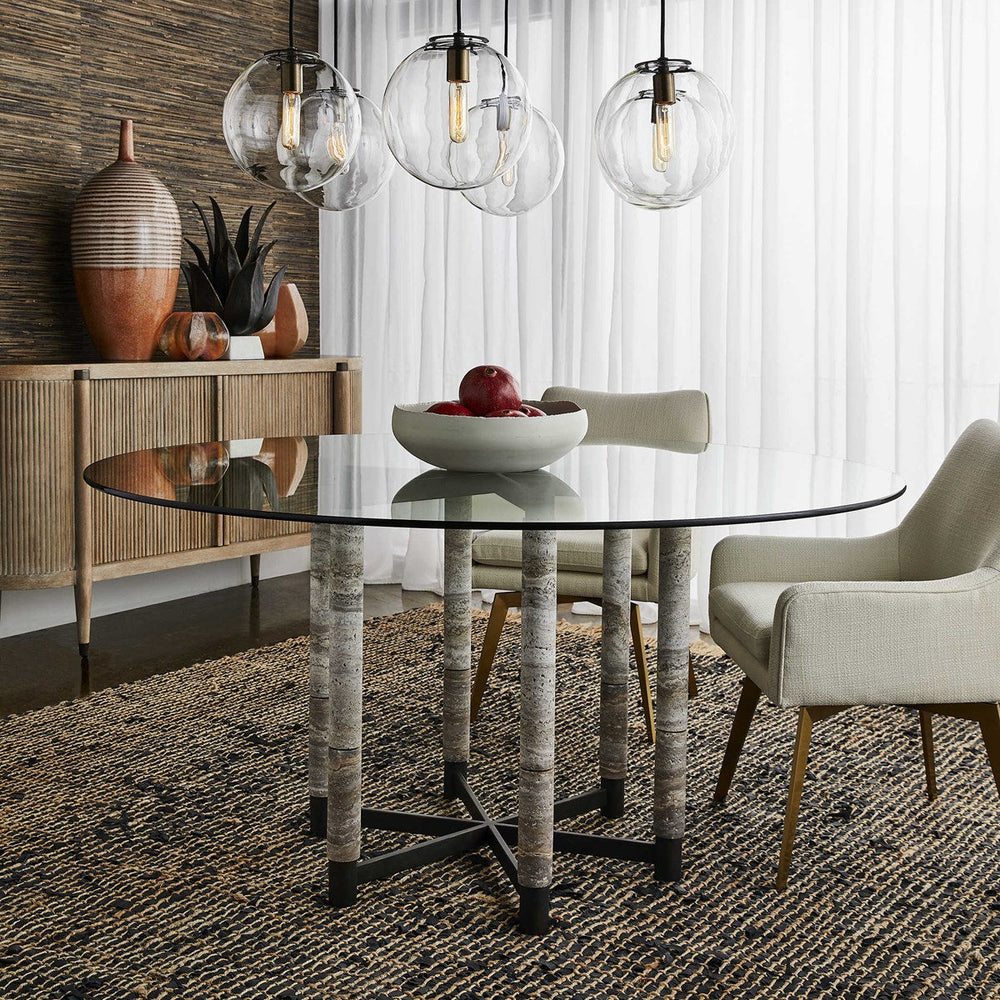 The Hex Dining Table features unfilled stone pillars, similar to travertine, in rich shades of gray and beige accented with acid bronze finished metal. The 1/2" clear tempered glass top has a pencil polished edge and attaches to the base with six flat bronze pucks for added stability. The 60" top comfortably seats six.