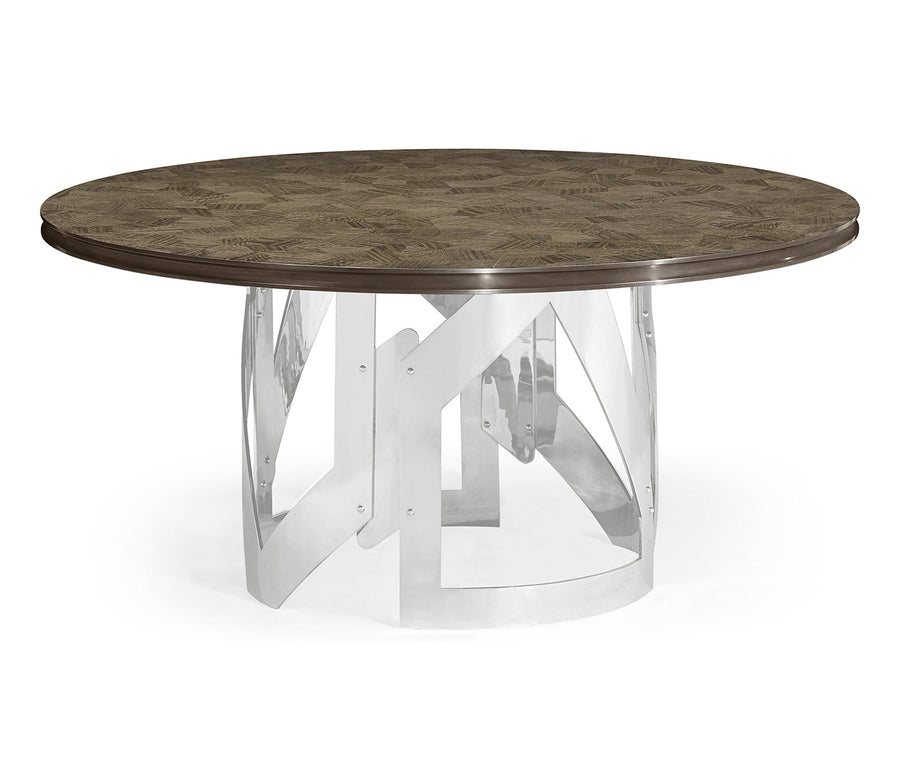 This dining table features a fixed top with an Art Deco inspired, Eucalyptus veneer pattern. Base is fabricated from stainless steel.
