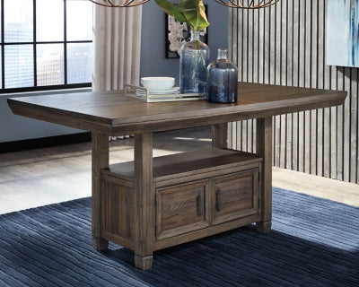 Reminiscent of lodge style furnishings, the Johurst counter-height gathering table provides plenty of space for family dinners or meals with friends. Cleverly designed base features display shelf and cabinet with doors on either side for easy access.