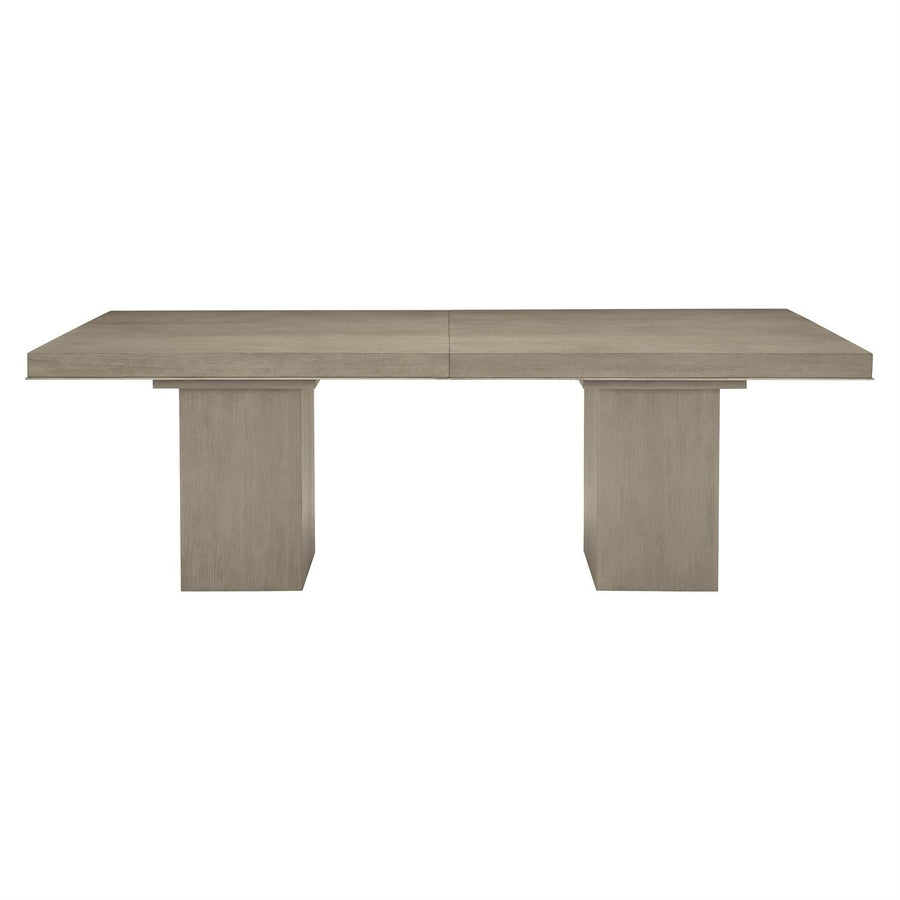 With its flawless artistry and understated elegance, Linea sets a new standard for rustic modern collections. For a refined yet casual look, the Linea dining table pairs a clean transitional form with a laid-back finish. Two pedestals support a rectangular top in a balanced, geometric composition. The oak veneers have been wire brushed and cerused, adding subtle textures while leaving a white hang-up in the grain. Adding a layer of subtle sophistication, cast aluminum bead trim around the apron is presented in a Textured Graphite finish obtained through a multi-step process.