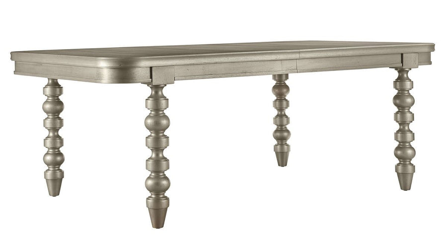 Inspired by the exuberance of traditional West Indies style, this dining table sits in four robustly turned legs. Constructed of parawood solids and primavera veneers, the 80-in table can be extended to seat ten people with the addition of a 24-in leaf. The Oldham Dining Table is finished in a warm semi-transparent gray stain.