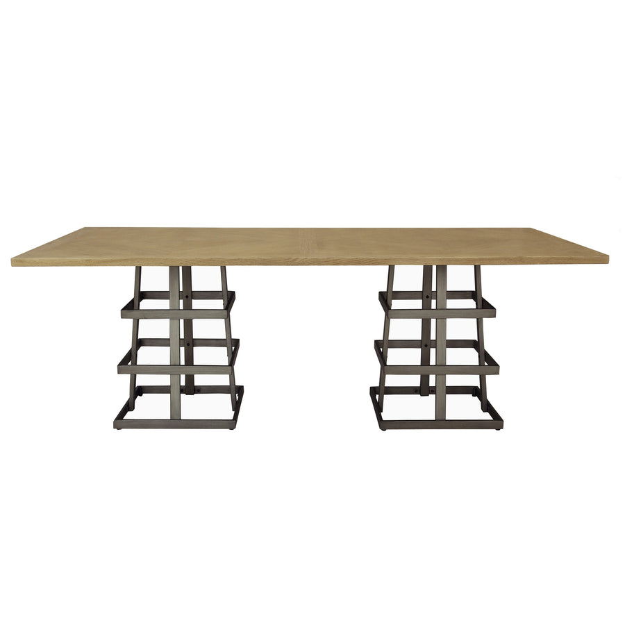Appealing dining table design mixes elements of industrial flair with an airy, casual color palette,Double-pedestal design offers ample room for friends, family, and guests to gather,Light blonde-finished top is accented with natural wood graining and subtle patterning,Strapped metal pedestal design offers sturdy support without weighing down the profile,Built with select hardwoods, manufactured wood, veneers, and metal for longevity,Assembly is required; two people are recommended to complete table setup