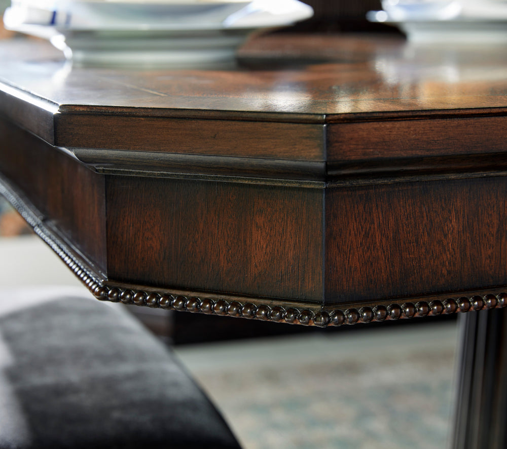 | Features | Top features swirl mahogany veneers, contrasting satin wood inlay, and canted corners, Apron features beaded trim, Two (2) drawers on either end of table top feature felt lined bottoms, Dual pedestal base features two fluted columns on bun feet, Inlcudes two (2) 20-in leaves that extend the table from 94-in to 134-in, Accommodates up to fourteen (14) chairs |