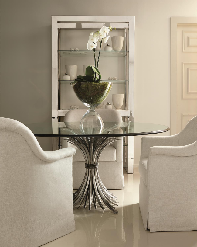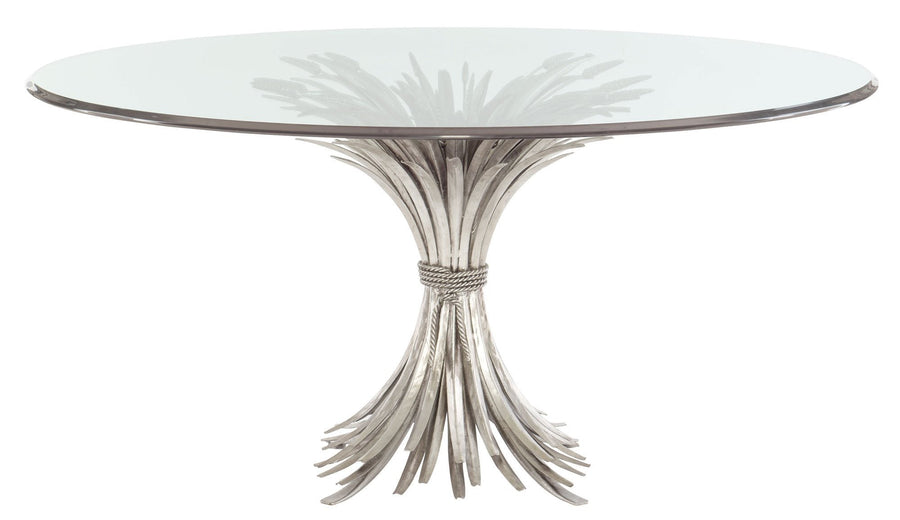 With its organic wheat motif design, the Somerset table brings an artistic and natural feel to a dining space. The cast aluminum base shimmers with plated leaves in a silver leaf finish, exhibiting meticulous craftsmanship. For a smooth finish, the clear glass top features an eased, polished edge.
