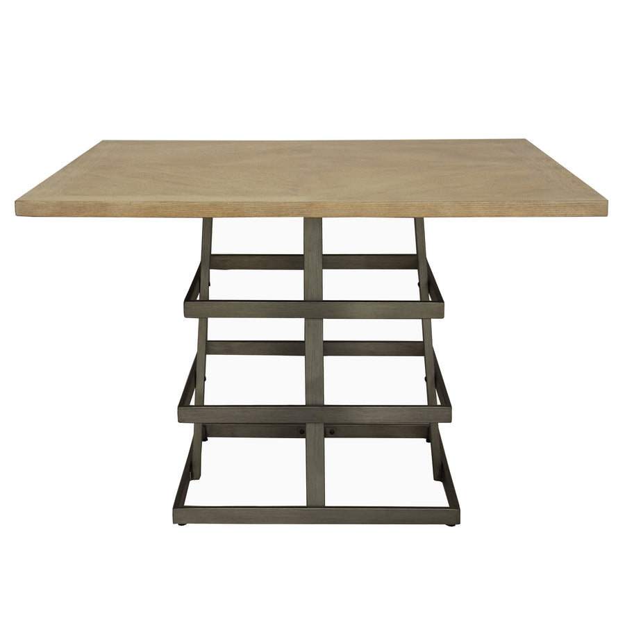 Appealing dining table design mixes elements of industrial flair with an airy, casual color palette,Single-pedestal design offers maximum style impact in minimal floor space,Light blonde-finished top is accented with natural wood graining and subtle patterning,Strapped metal pedestal design offers sturdy support without weighing down the profile,Built with select hardwoods, manufactured wood, veneers, and metal for longevity,Some assembly required; hardware kit and instructions included