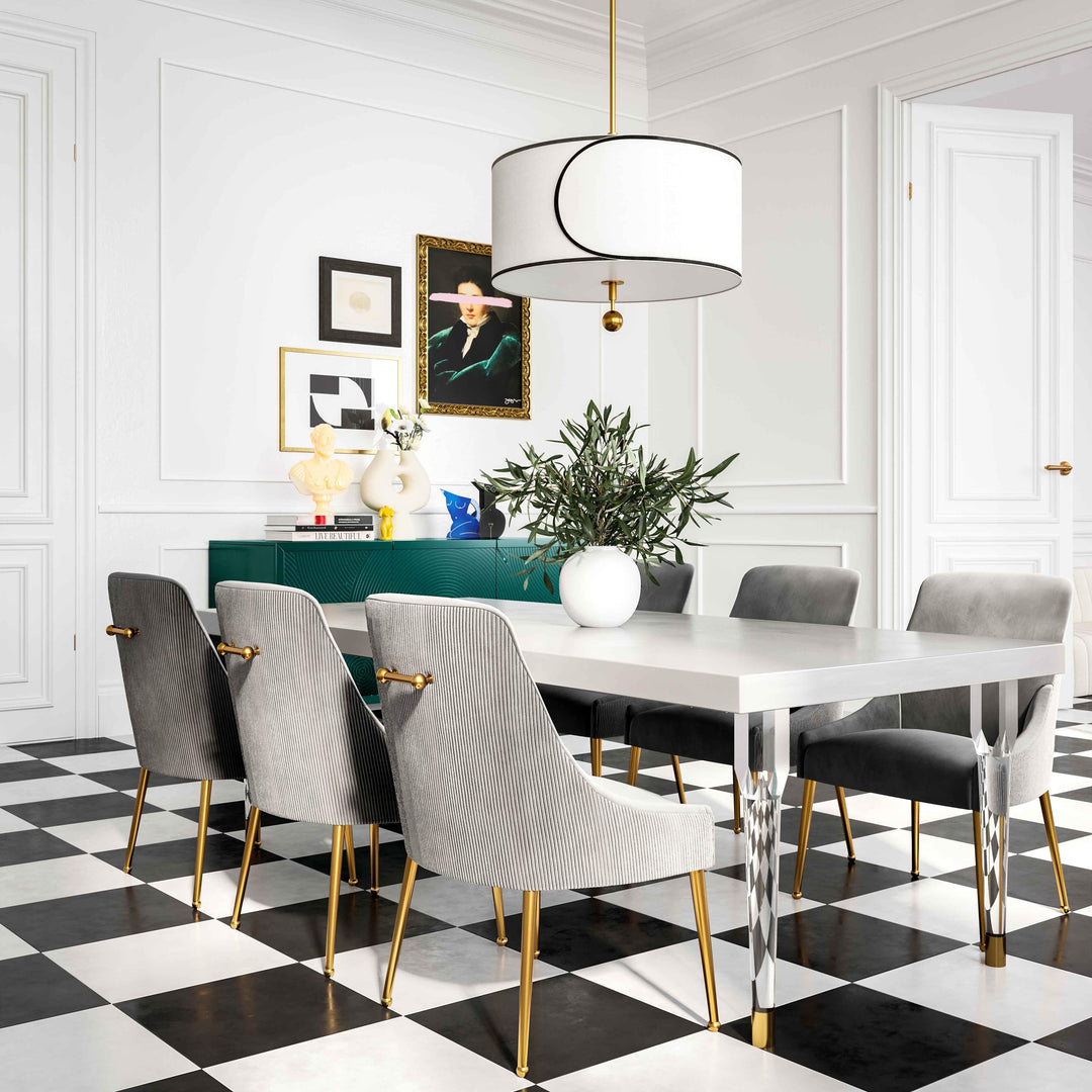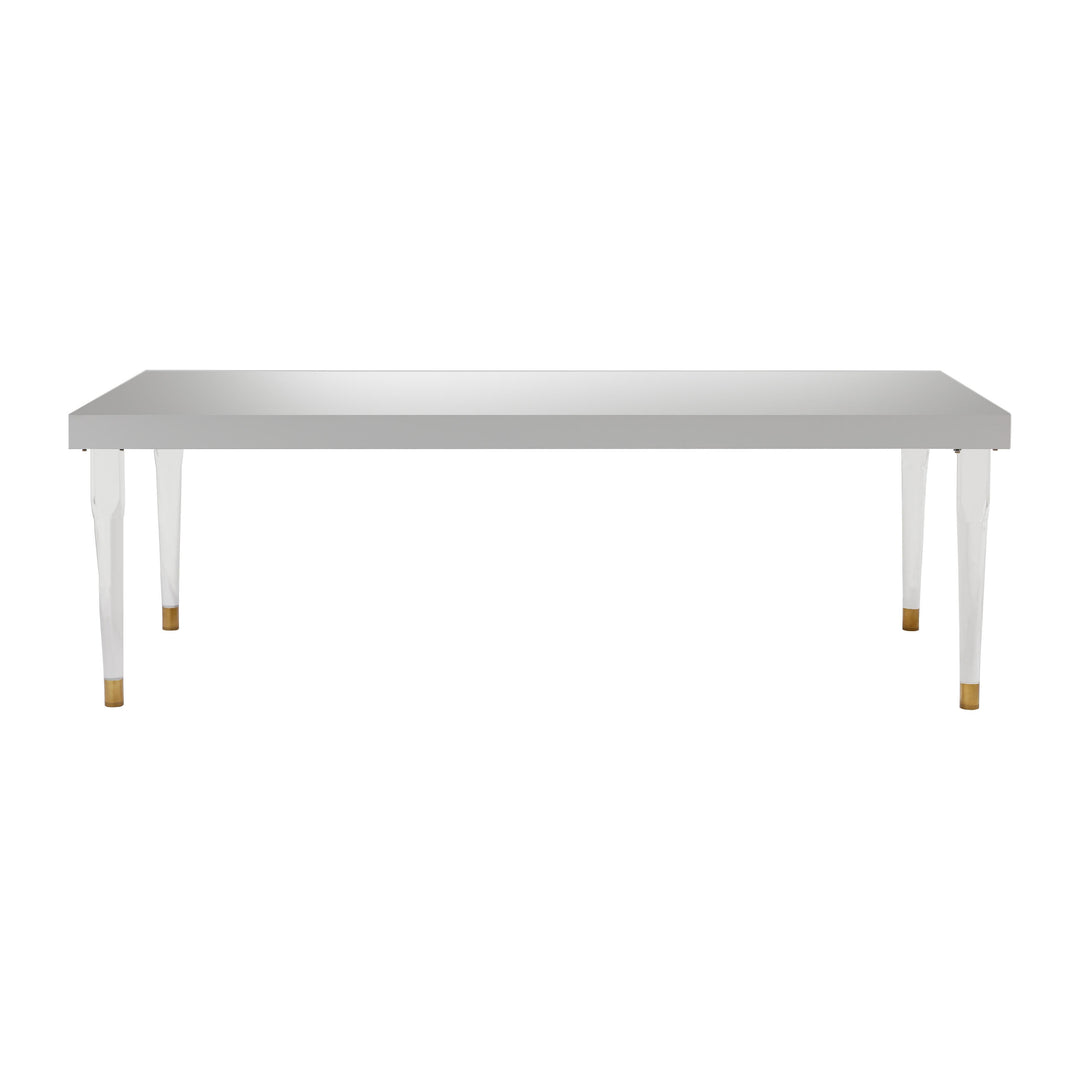 | Features | Handmade by skilled furniture atisans High gloss white lacquer finish Transparent legs with gold tips Can seat up to 10 people Minimal assembly required. |