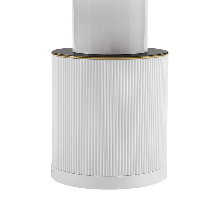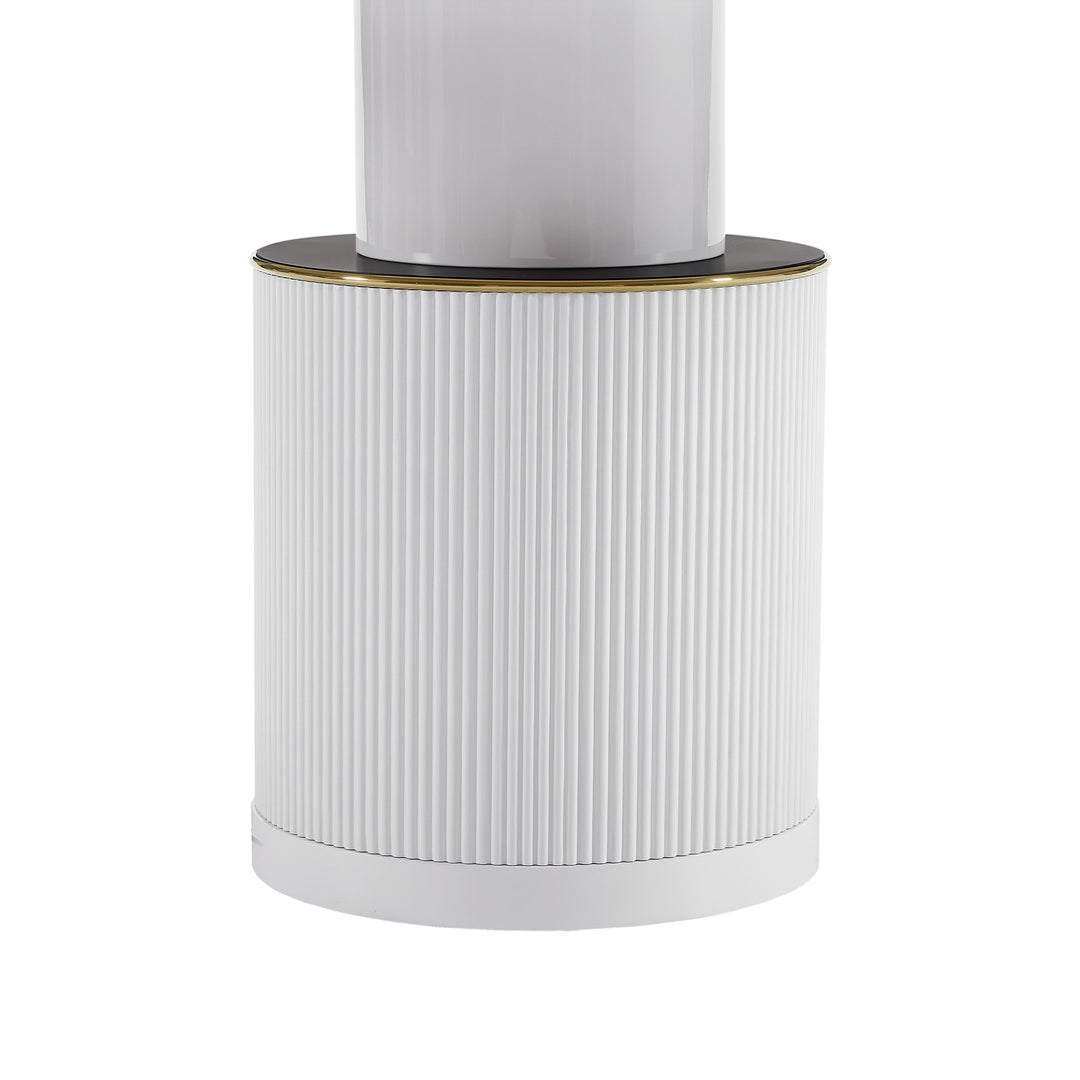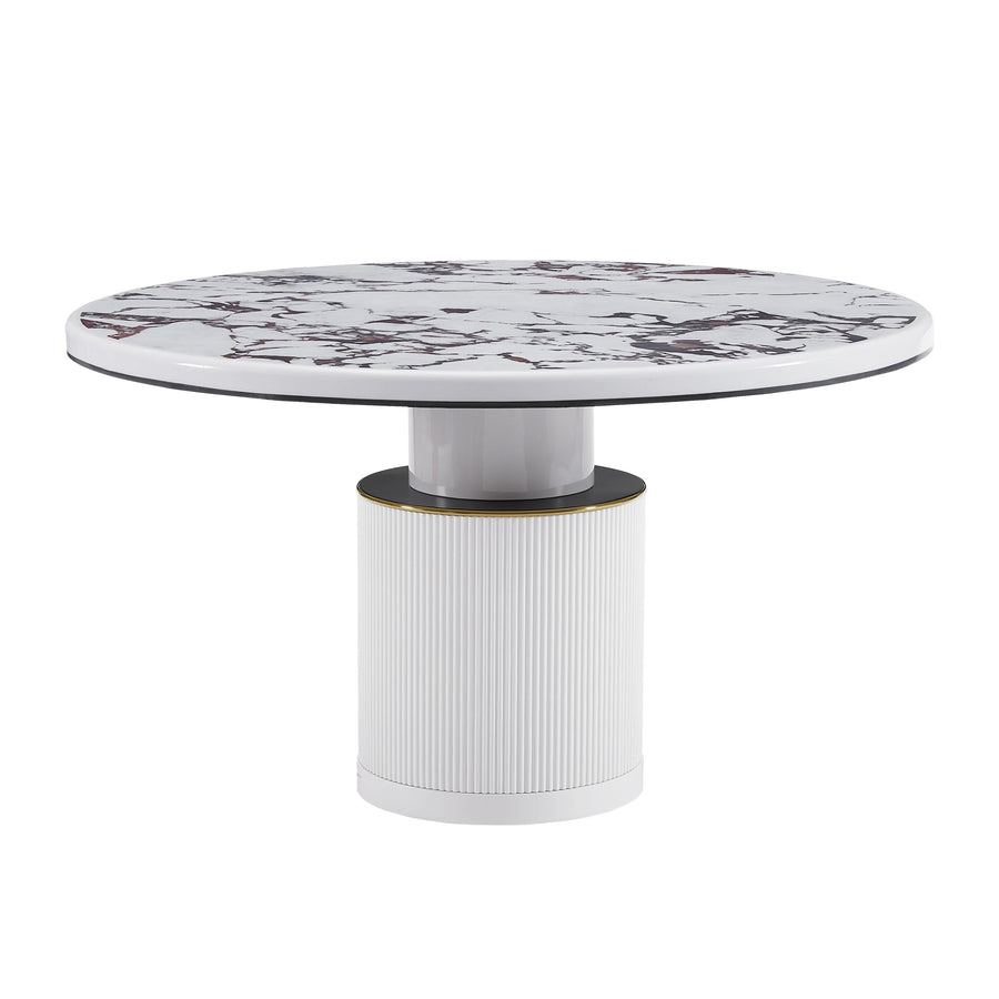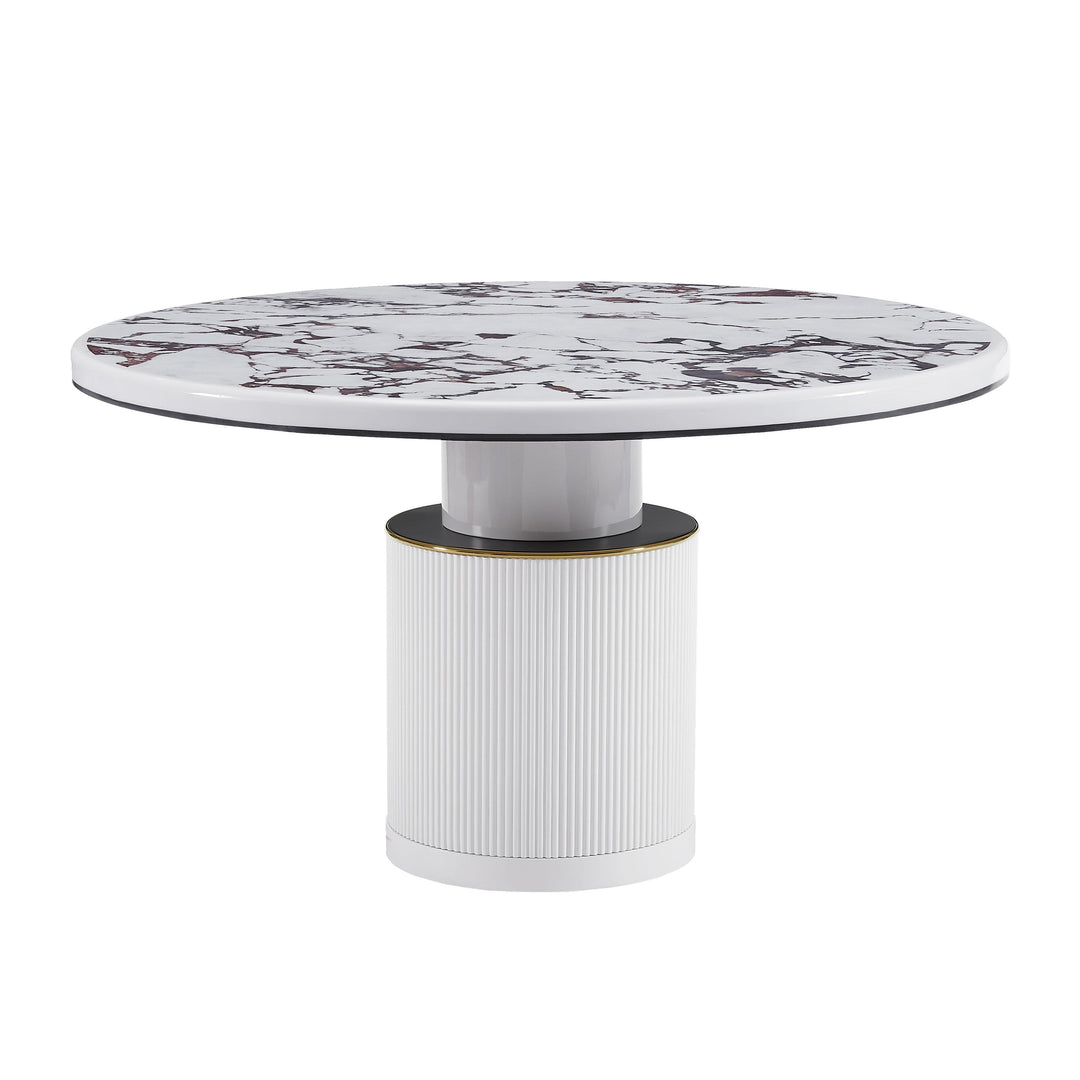 Simple and modern meets glam style with the Vanessa White Marble Lacquer Round Dining Table! Handcrafted to perfection, this table is the perfect certpiece in your dining space. The round, ribbed base features beautiful gold and black detailing topped with an elegant and durable faux marble table top.