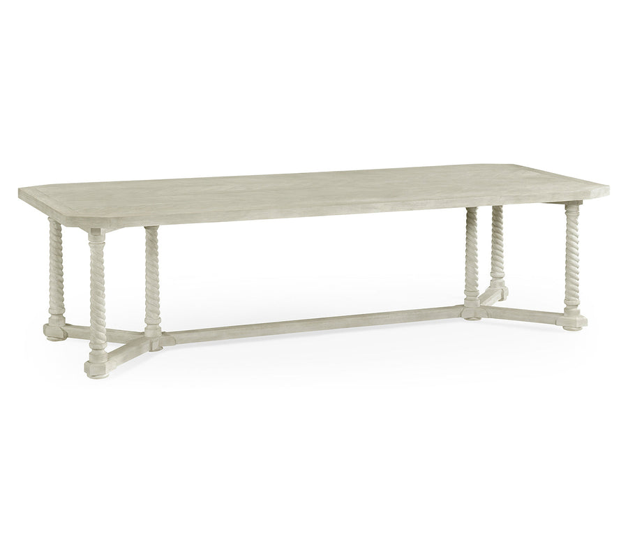 Constructed of beautiful oak, the barley twist columns support a hand coloured and finished herringbone top with cut away corners and a great stretcher below. This table happily accommodates family and friends. (Old salescode: 530109)