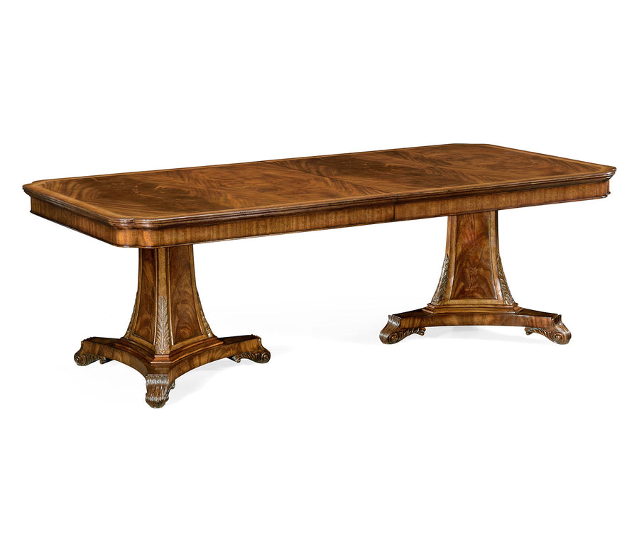 Neo-classical twin pedestal crotch walnut dining table with two self-storing leaves that can be opened individually, cross banding to the top and contrasting veneers to the pedestals. Seats: 8 + 2 + 2. (Old salescode: 494418)