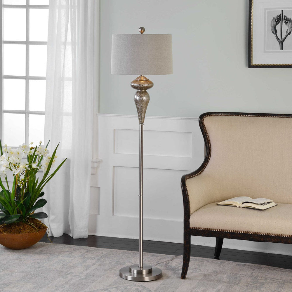 Smoked mercury glass accented with brushed nickel metal details. The slightly tapered round hardback shade is a light beige linen fabric. Packed 2 per box but priced individually.