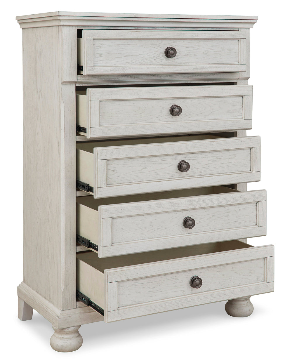 Elegant, timeless furnishings take your bedroom to the next level. Nothing does that better than the Robbinsdale chest of drawers. The antiqued white finish with a wonderful grain texture radiates sophistication, while dark bronze-tone knobs add an ornate touch. Felt finishing in the upper drawers rounds out this tasteful piece.