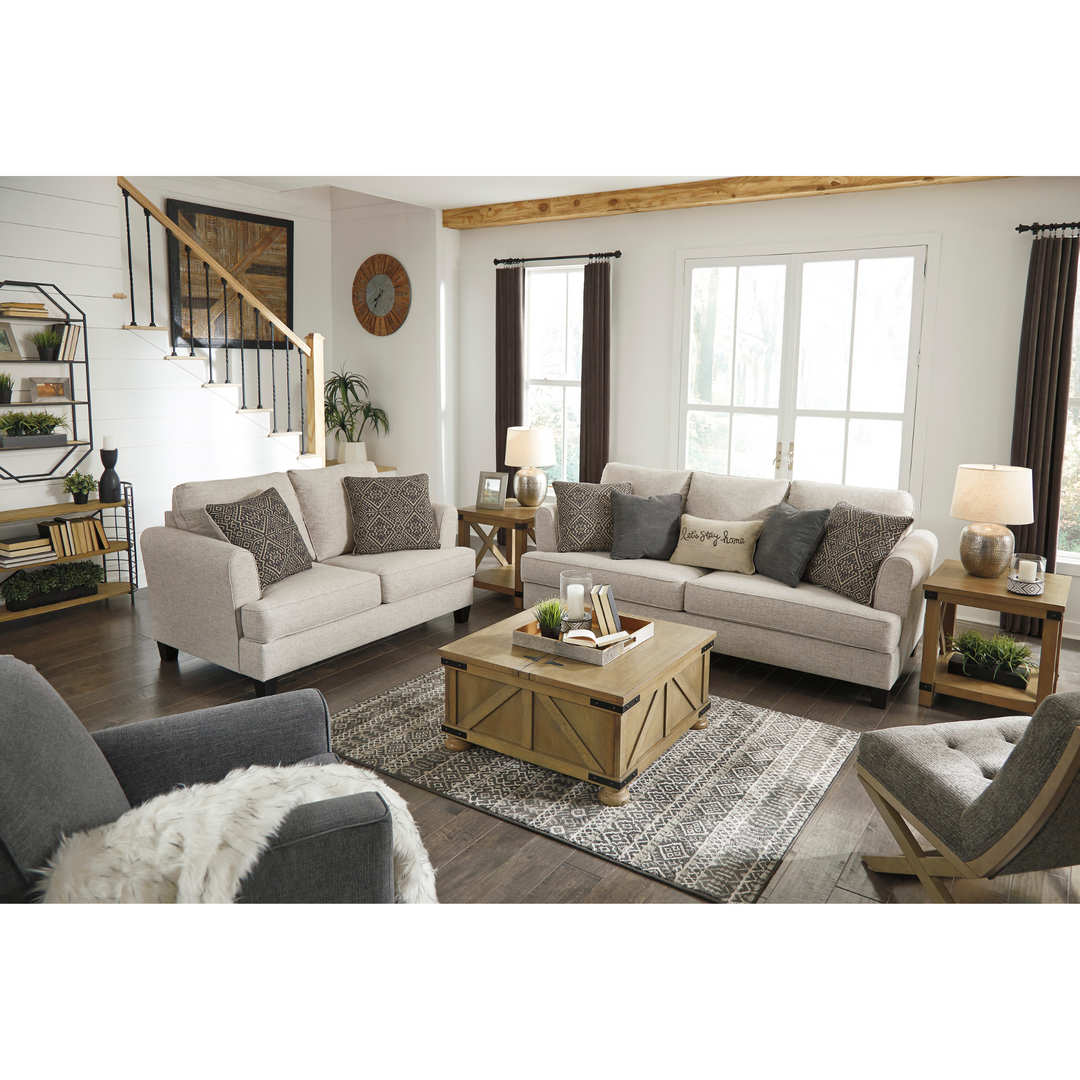 Corner-blocked frame;Attached back and reversible seat cushions;High-resiliency foam cushions wrapped in thick poly fiber;Platform foundation system resists sagging 3x better than spring system after 20,000 testing cycles by providing more even support;Smooth platform foundation maintains tight, wrinkle-free look without dips or sags that can occur over time with sinuous spring foundations;5 toss pillows included;Pillows with soft polyfill;Polyester upholstery; polyester, polyester/linen, polyester/rayon pillows;Exposed feet with faux wood finish