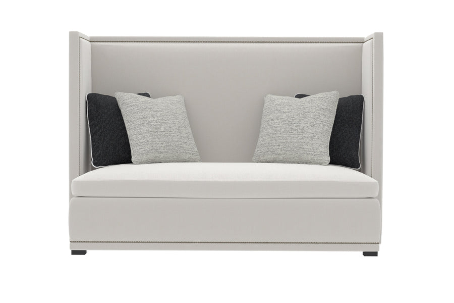 The Marcourt banquette reimagines a classic design for modern times. With an ultra-high back and track arms, it provides a deeper level of intimacy than traditional banquette seating. A padded back and spring down cushion offer enduring support. Nailhead trim accents the clean lines, adding an extra touch of refinement.