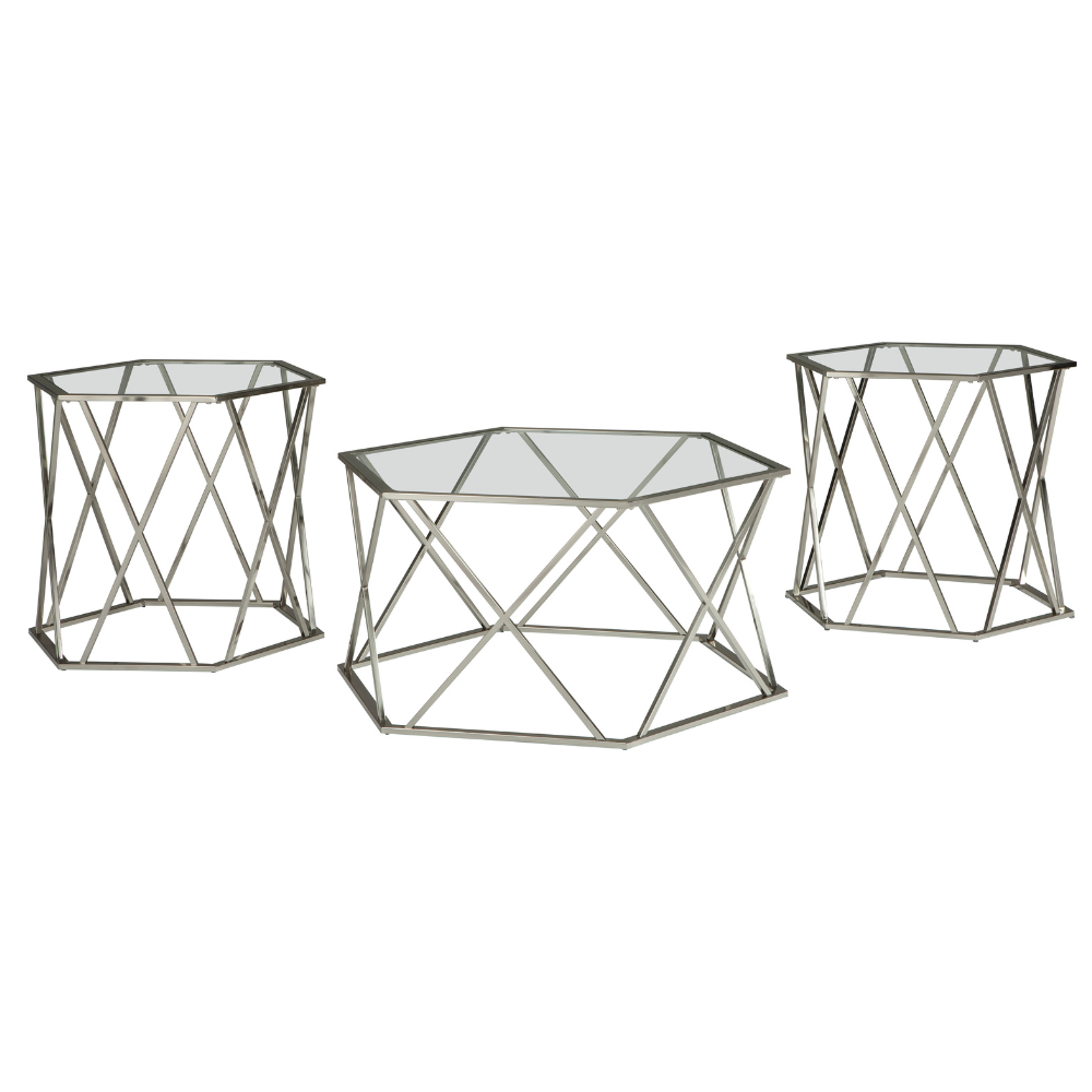 Includes 1 coffee table and 2 end tables; Made of clear tempered glass with polished edge and metal; Hexagonal shape with X brace design; Metal in chrome-tone finish; Assembly required; Expert assembly recommended; available at check out for an additional fee