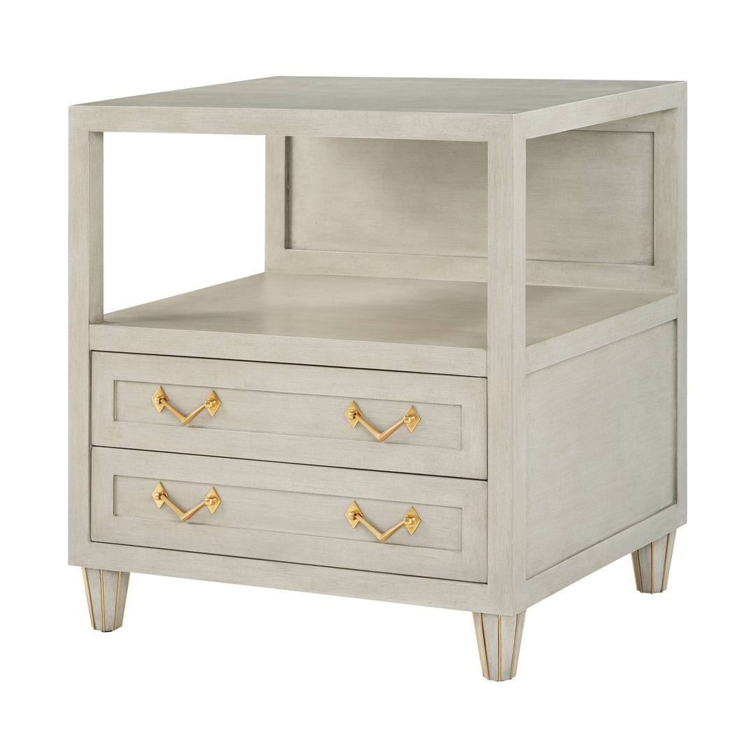Sometimes nightstand, accent table or end table, sleek-lined Regina works a room with modern finesse. Ample storage and display space with one open shelf and two drawers with jewelry-like Hampton Brass finish handles. Set on octagonal tapered feet.