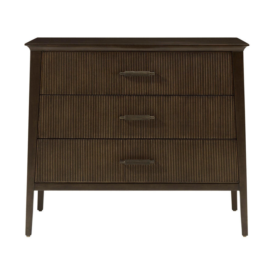 The Lido Nightstand, crafted from Prima Vera in our Bistre finish, features a sophisticated tapered silhouette with 3 reeded drawer fronts. The custom forged hardware, finished in a dark rubbed bronze, echoes the reeded details throughout.