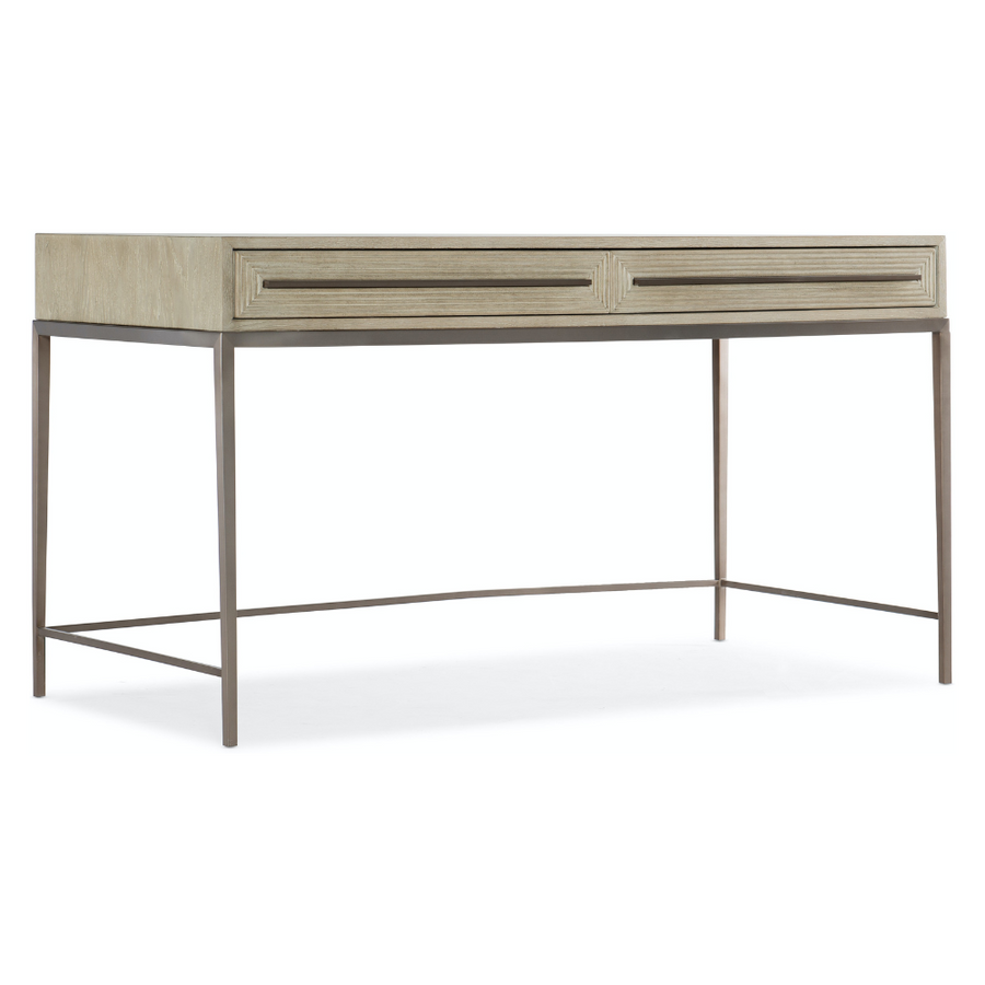 Svelte and sophisticated in a serene soft finish on Oak Veneers with tactile reeded drawer fronts, the Cascade Writing Desk is a stylish statement piece and a functional work-from-home solution. The Terrain finish on oak veneers is dry-brushed for a casual appeal and accented by champagne-colored bar pull hardware and slender metal legs joined by stretchers on the sides and back. The left drawer has one removable pencil tray with a felt bottom that can be used in either drawer, and the right drawer has one removable divider with two sides. Designed to interject a sense of calm and tranquility into interior spaces, the Cascade Collection creates an elegant - yet livable Ð retreat from our modern day, fast-paced lifestyles. Characterized by its light and airy neutral color palette and use of mixed materials including oak, lacquered burlap, metal accents and champagne-tone hardware, the collection's modern styling can easily find its way into a variety of interiors across the country. As soothing as water falling from a steep rocky slope, the Cascade Collection was designed to spark Zen, tranquility and calmness in any living space.